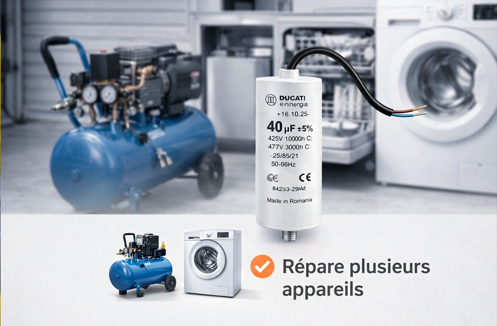- Remplace efficacement un condensateur usé ou défectueux